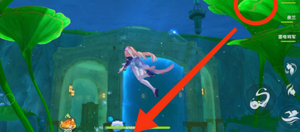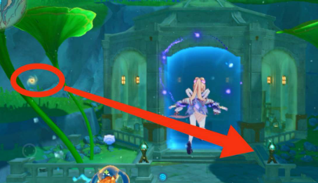 3、再去右侧最高的绿物上拿到蓝球,普攻锁左侧机关,机关变色即可解锁宫殿入口。