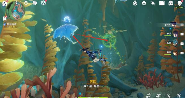 2、接着玩家需要找美露莘,在指引点跳入水里过剧情,先打鱼吸收它的能力再打海草球,打掉连接球的3根海草上的亮点即可。