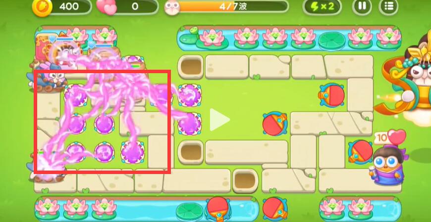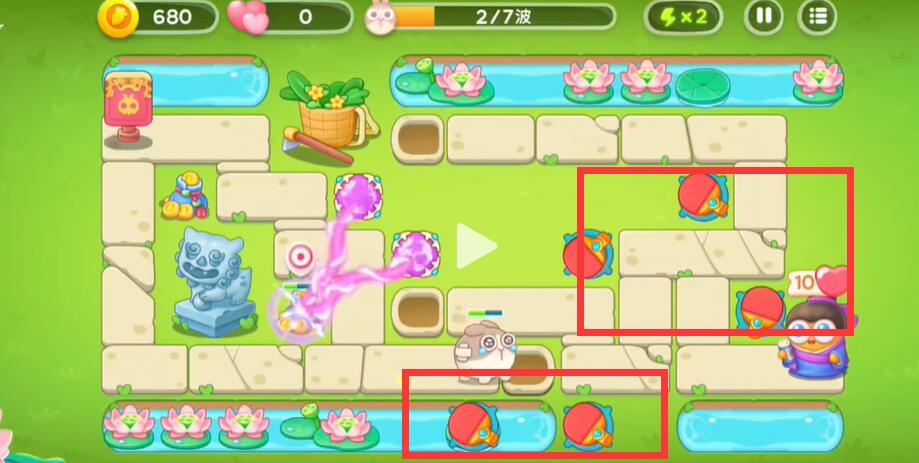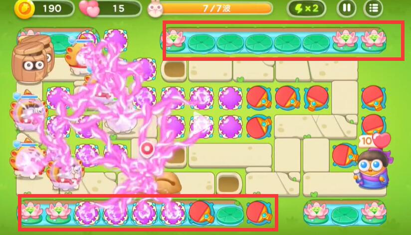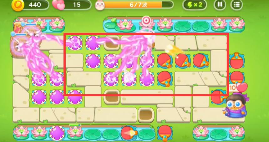5、逐渐的将中间的空位摆满之后对池塘里的荷花进行攻击。