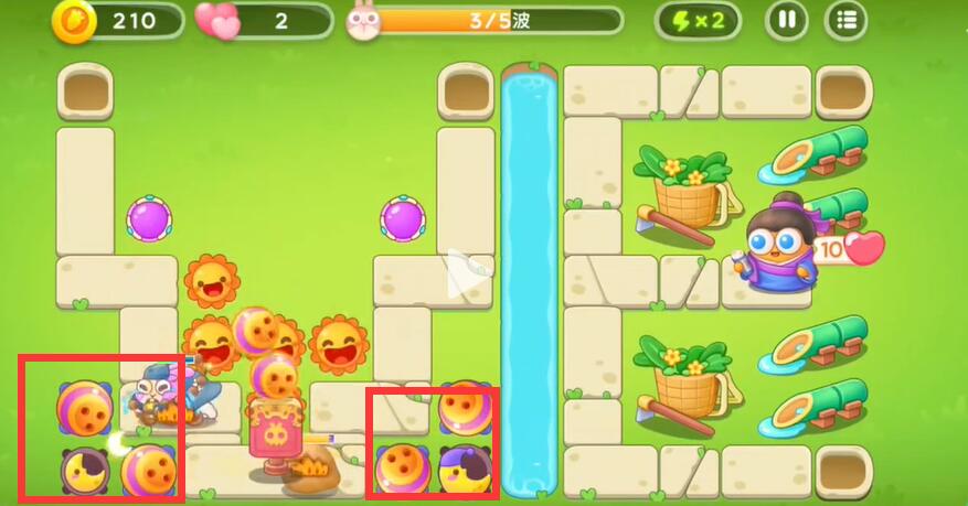 4、将这里的保龄球以及魔法球等炮塔全部升满级可以将兔子堵死在这。