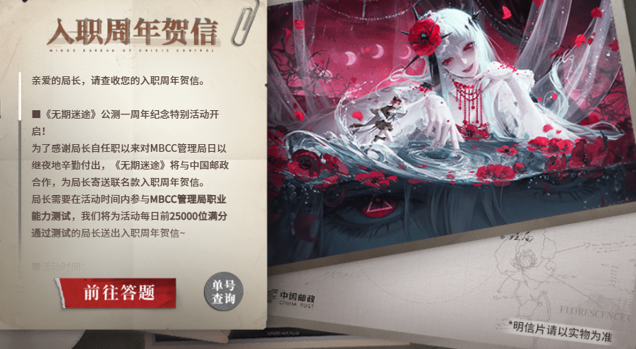 步骤1:局长点击链接登录游戏账号后参与MBCC管理局职业能力测试,我们将为活动每日前25000位满分通过测试的局长送出入职周年贺信。