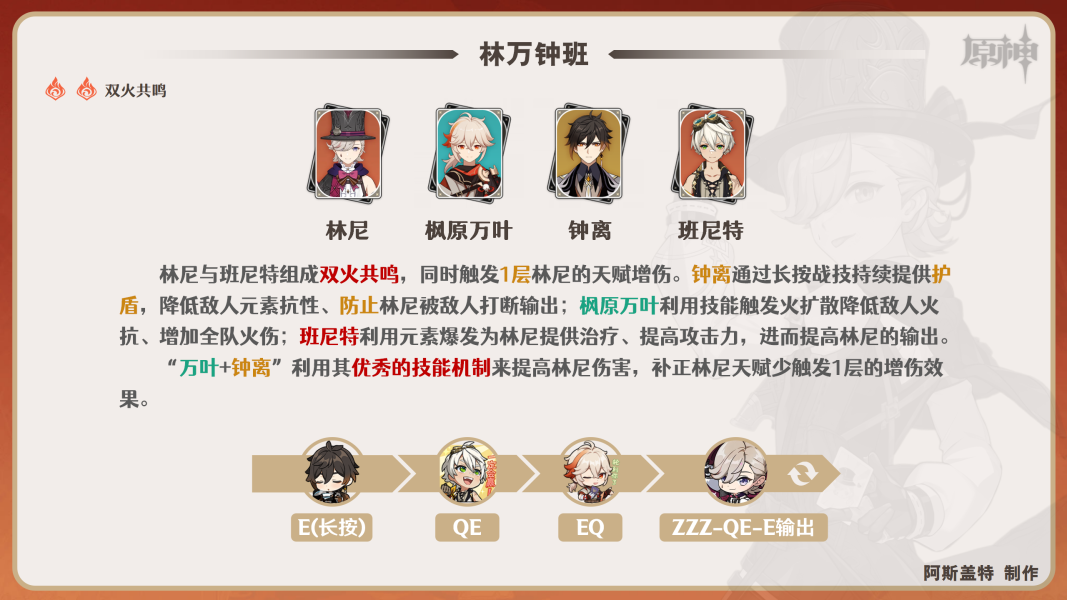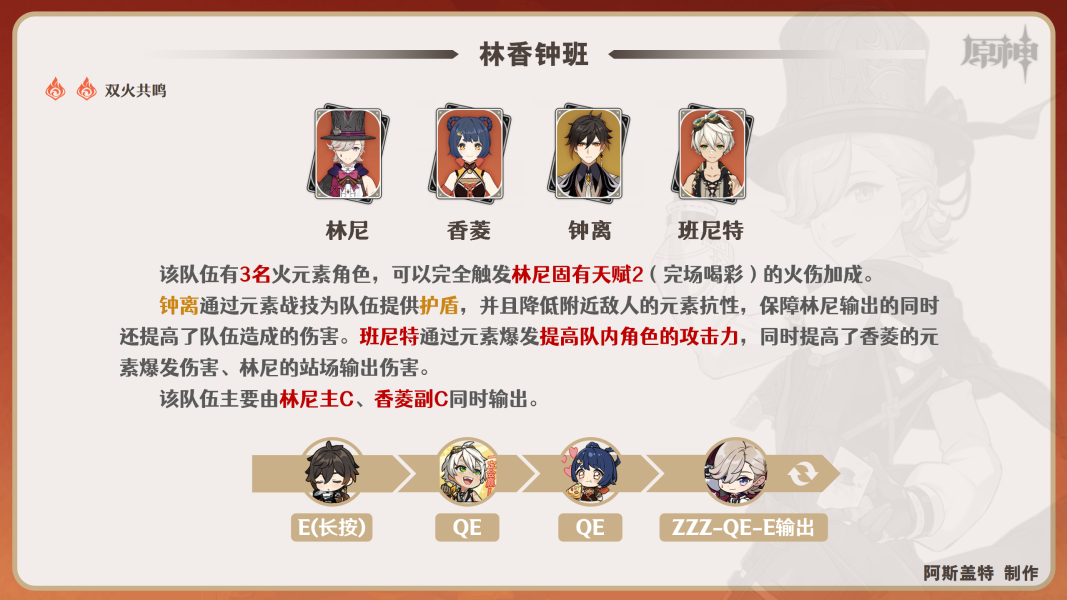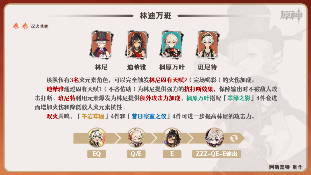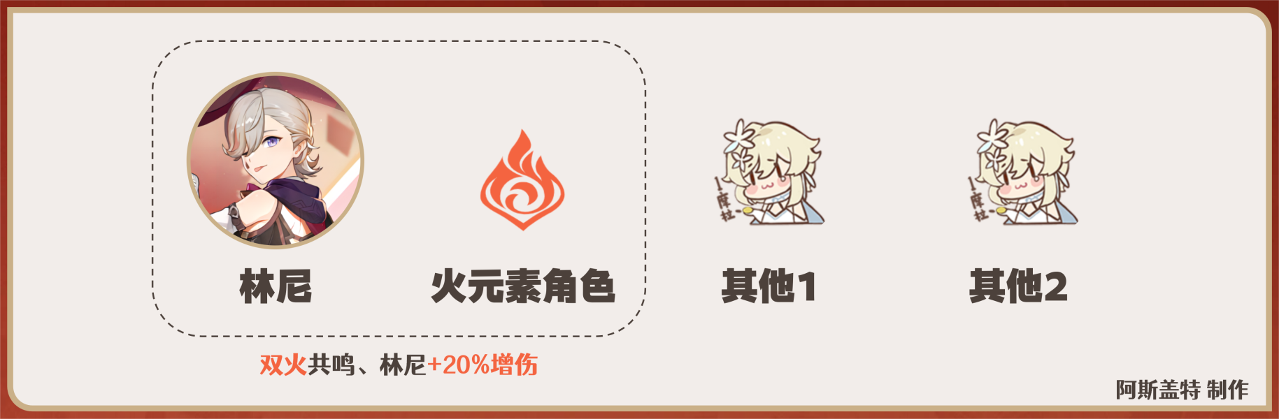前面提到,固有天赋2的不同层数间的差距在7%左右,所以林尼的配队既可再选择1名火元素角色组成“三火队”,又可选择其他元素的辅助、副C角色提高队伍整体输出。