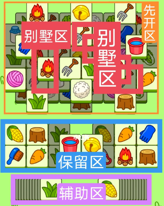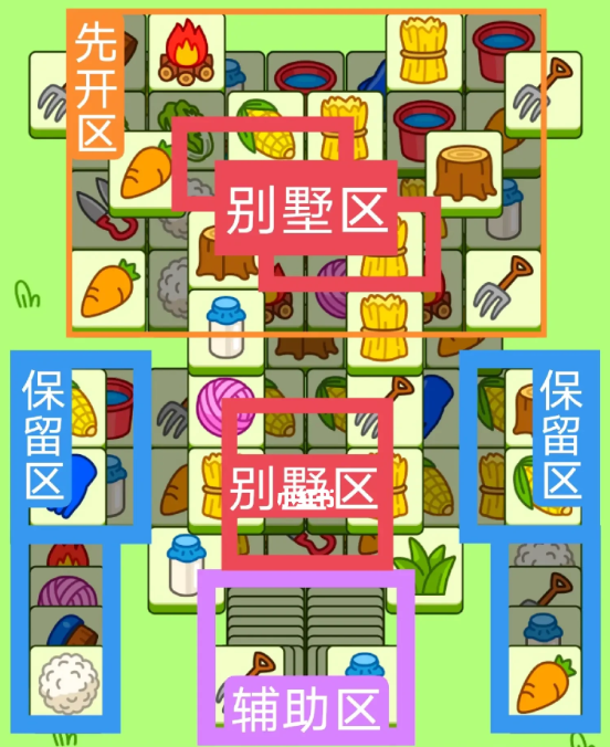 四个斜着的长形别墅组成,开局先消除橙色区,这里压牌此较多,然后按照一层层均匀消除表面牌,不要跨层太多拿牌。必要时可以用盲盒区辅助消除表面牌,尽量还是以别墅区内互相消除为王,蓝色区基本都是明牌,全部保留到后期使用。