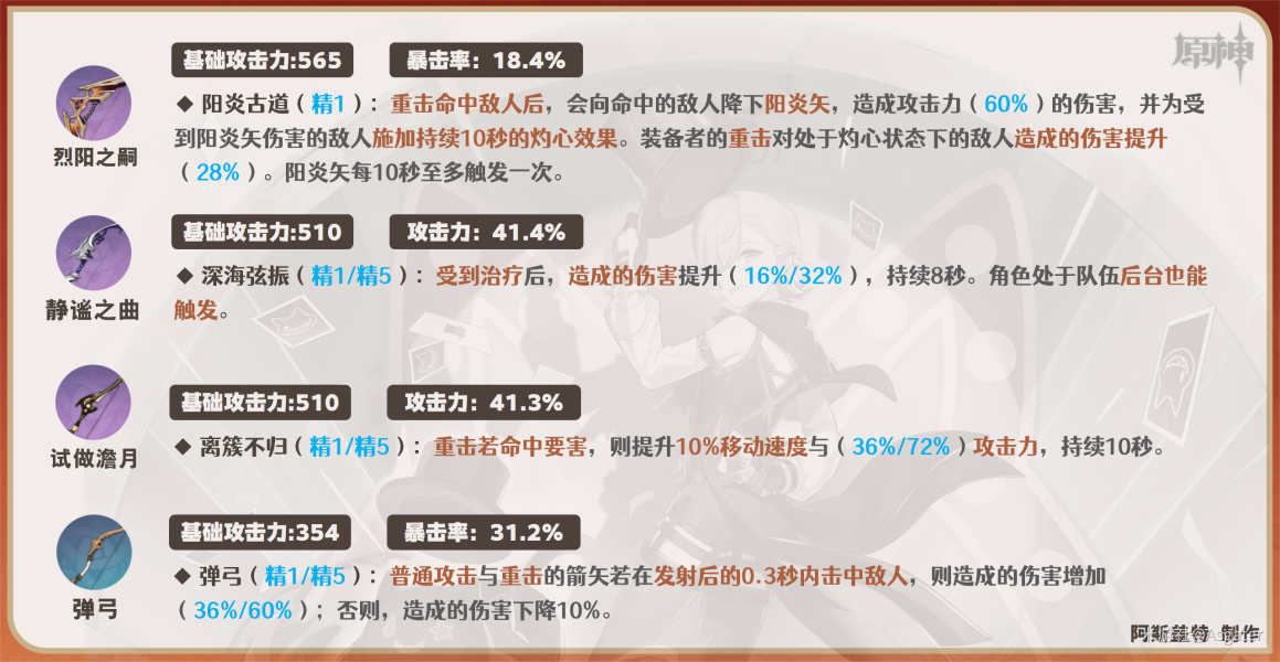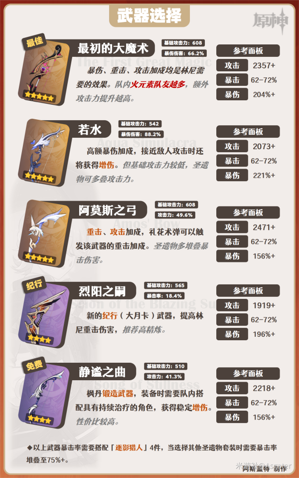 ①.弹弓:需要队内提供攻击力加成的手段,弥补低基础攻击力的不足。前期圣遗物较差时,用以“拔高”暴击率。