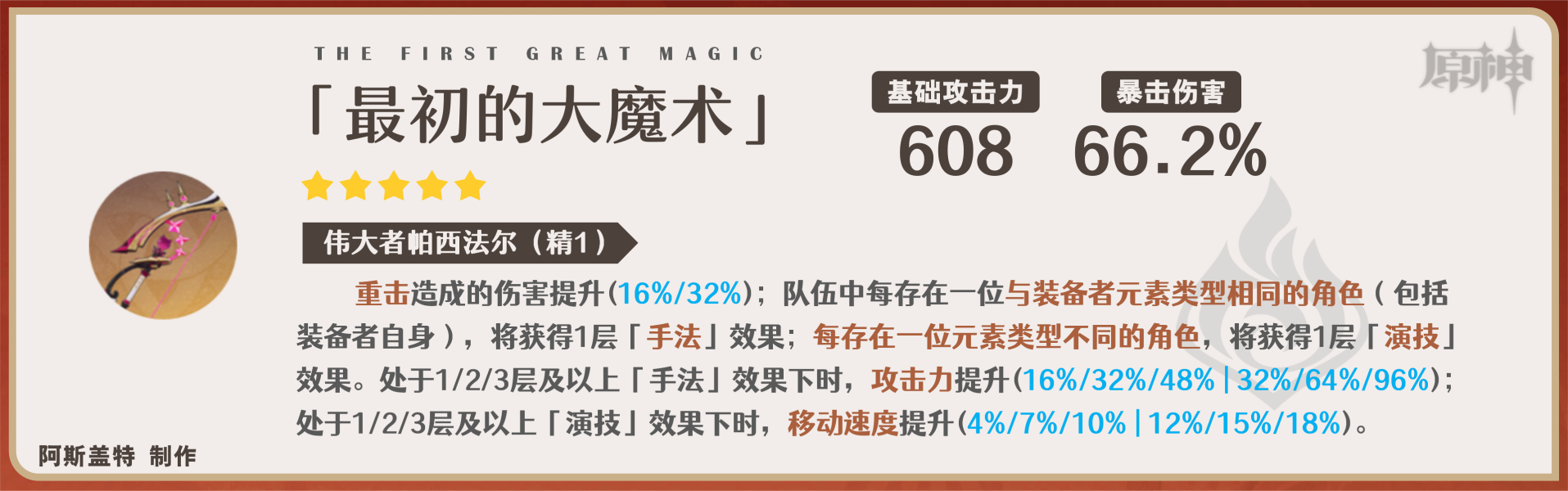完全触发需要3名火元素角色(包括装备者);套装优选「逐影猎人」4件套。队内有更多额外攻击力提升手段时,该武器与其他武器的差距将会缩小。