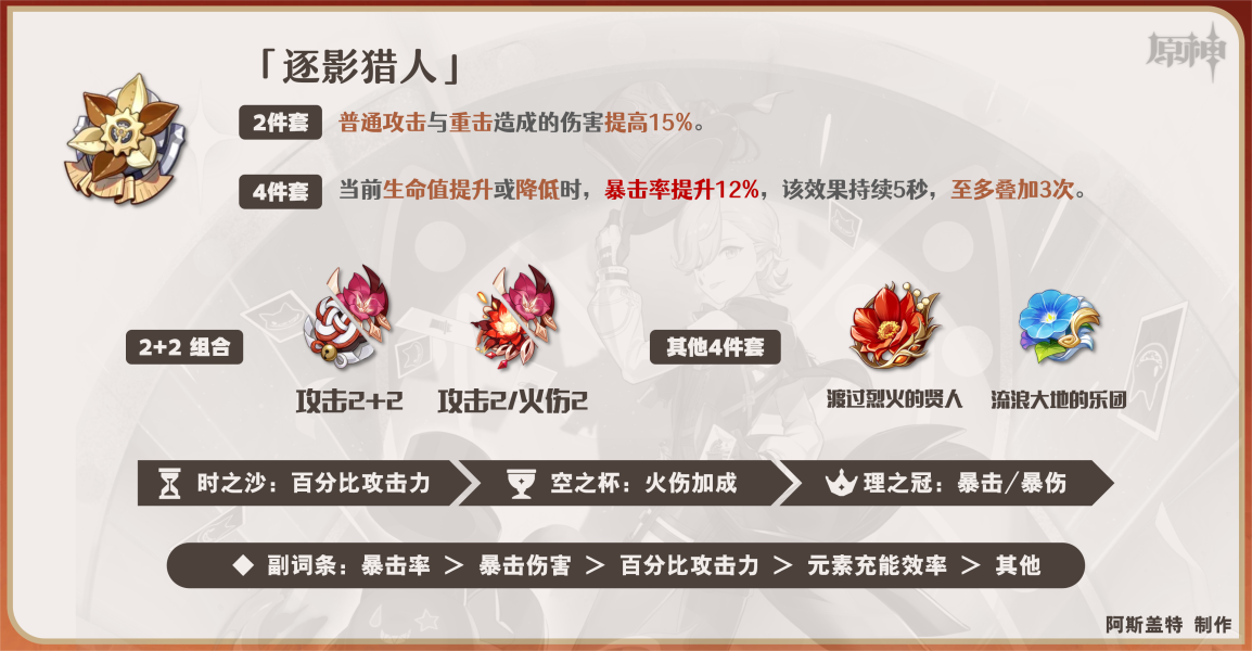 ①.优先考虑「逐影猎人」4件套,林尼通过自身技能的生命消耗/恢复、搭配治疗角色等手段都可持续触发该套装的暴击率加成。