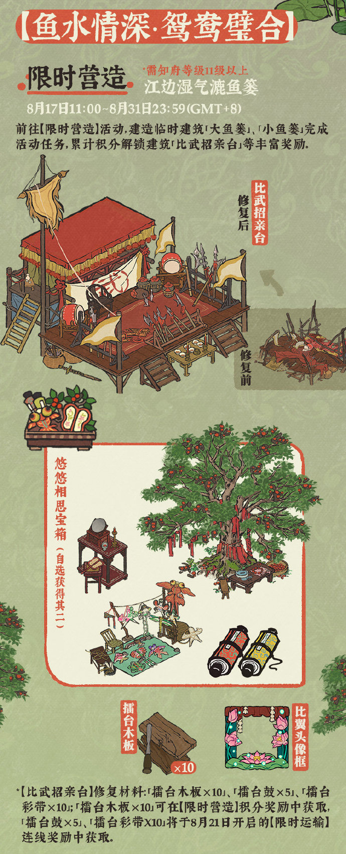 前往【应天府】建造活动建筑「大鱼篓」「小鱼篓」,累计营造积分,可解锁「悠悠相思宝箱」「比翼头像框」「比武招亲台(待修复)」及修复材料「擂台木板*10」等丰富奖励。
