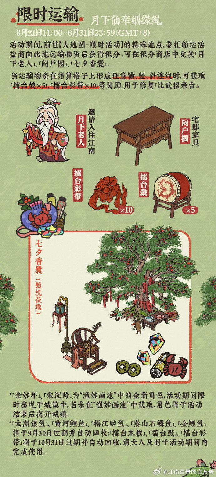委托船运或盐商向大地图上的临时地点【限时活动】运输物资,累计运输积分,可兑换「月下老人」「闷户橱」「七夕香囊」。当物资运输满足达成任意方向的连线时,可获取修复材料「擂台彩带*10」「擂台鼓*5」等奖励。