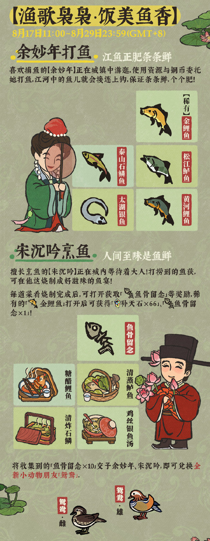 一对新人【余妙年】【宋沉吟】正在城中游逛!消耗资源及铜币委托余妙年打鱼后,可将鱼获交予宋沉吟烹制美味的佳肴,打开后可获得「补天石」「百花礼盒」「鱼骨留念」等奖励。收集「鱼骨留念」可与余妙年、宋沉吟兑换全新小动物「鸳鸯」。