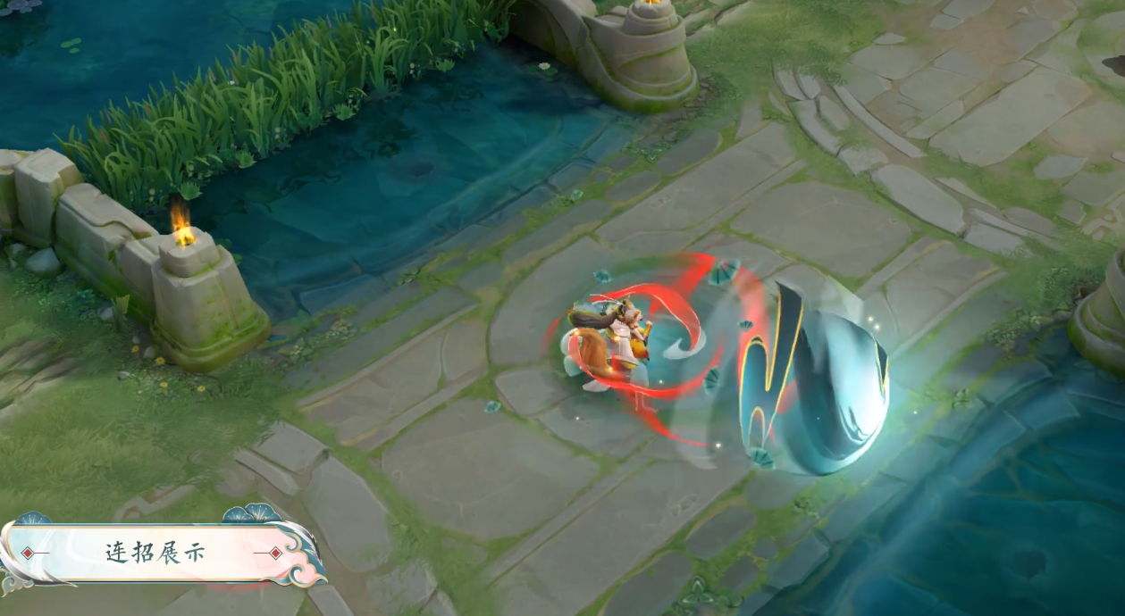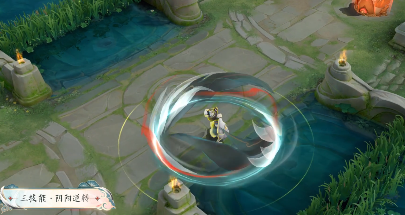 三技能:白鹤双翅围拢旋转,为怀真抵挡即将到来的伤害,随后鹤羽携能量球旋转发出对敌人造成伤害。