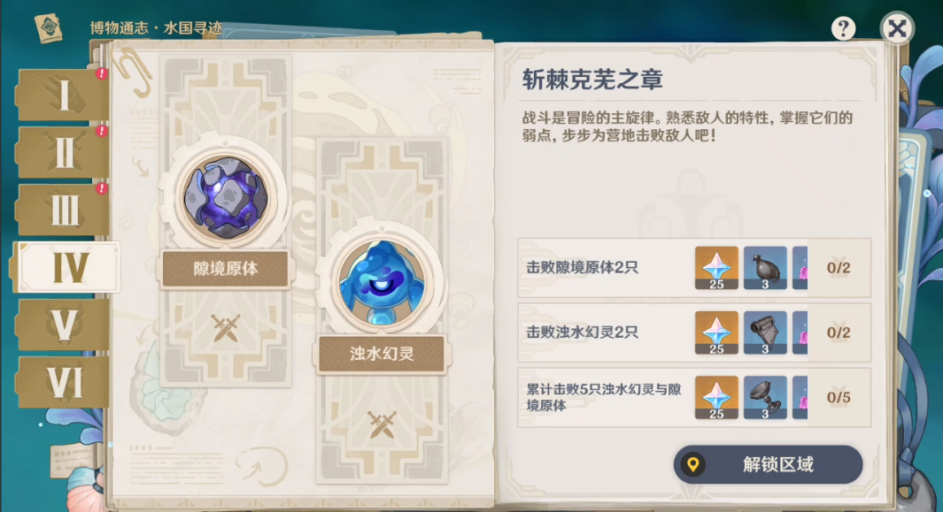 第四章为斩棘克芜之章,玩家需要击败隙境原体2只,浊水幻灵2只,再累积击败5只这些动物就可以了,能够获得75原石和材料,武器素材等奖励。
