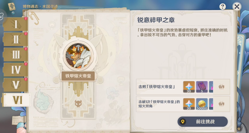 第六章为锐意碎甲之章,玩家击败铁甲熔火帝皇和击破一次铁甲熔火帝皇的熔火双角就能获得60的原石奖励和若干摩拉经验书啦。