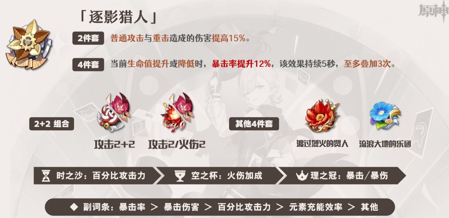 1.优先考虑「逐影猎人」4件套,林尼通过自身技能的生命消耗/恢复、搭配治疗角色等手段都可持续触发该套装的暴击率加成。