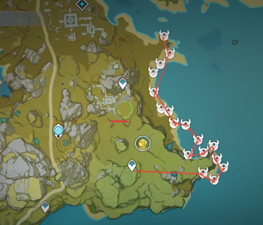 把地图位置从摇光滩向左下方移动,云来海上方的这个传送锚点旁边的海岸边,这里也是大量星螺的收集地点。