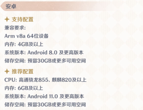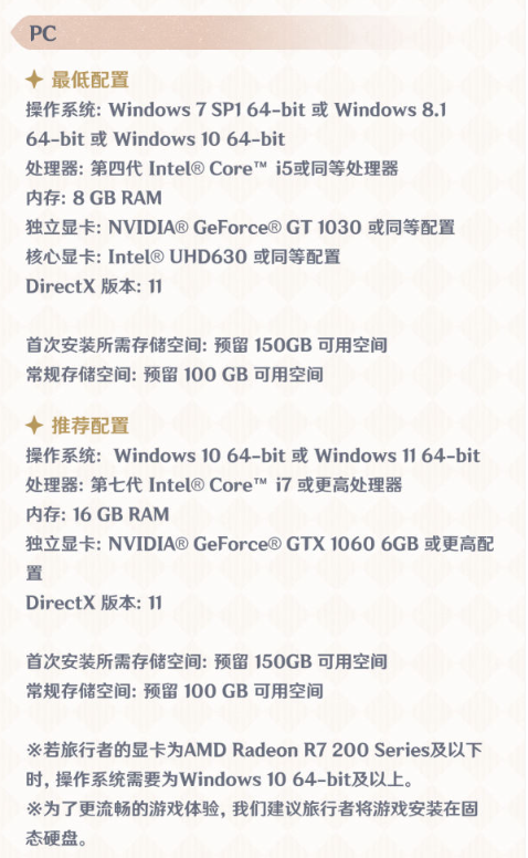 原神4.0游戏最低配置和推荐配置: