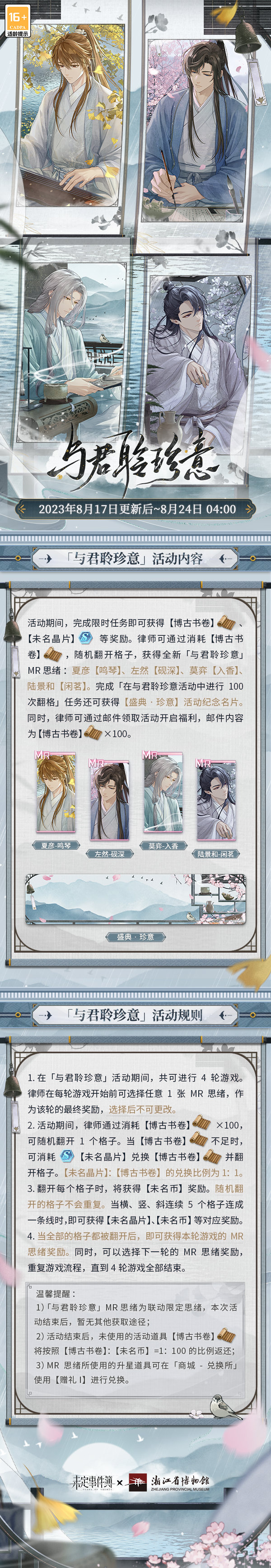 活动期间,完成限时任务即可获得【博古书卷】、【未名晶片】等奖励。律师可通过消耗【博古书卷】,随机翻开格子,获得全新「与君聆珍意」MR思绪:夏彦【鸣琴】、左然【砚深】、莫弈【入香】、陆景和【闲茗】。完成「在与君聆珍意活动中进行100次翻格」任务还可获得【盛典·珍意】活动纪念名片。同时,律师可通过邮件领取活动开启福利,邮件内容为【博古书卷】×100
