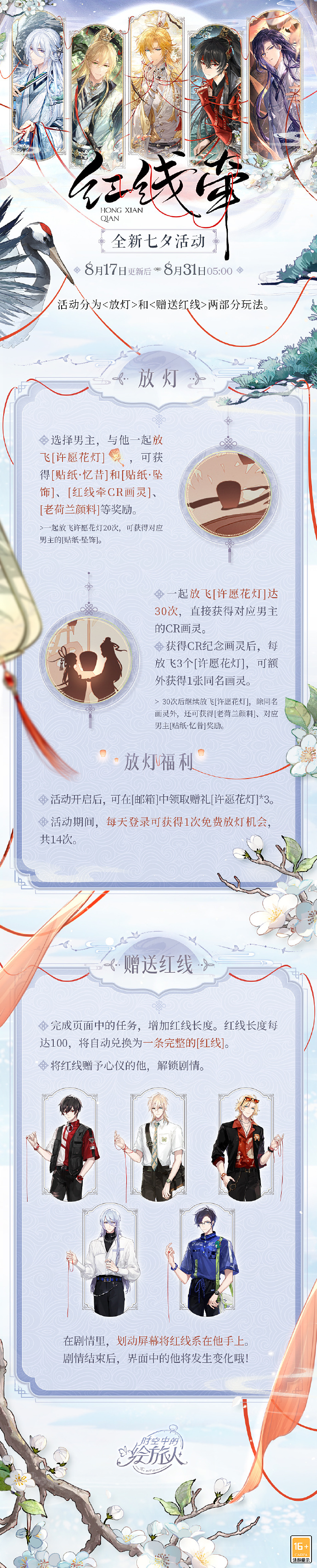 ► 与他一同放飞[许愿花灯],可获得奖励。放飞花灯满30次,可获得对应男主动态CR画灵,继续放飞可得到[老荷兰颜料]、[贴纸]等奖励。