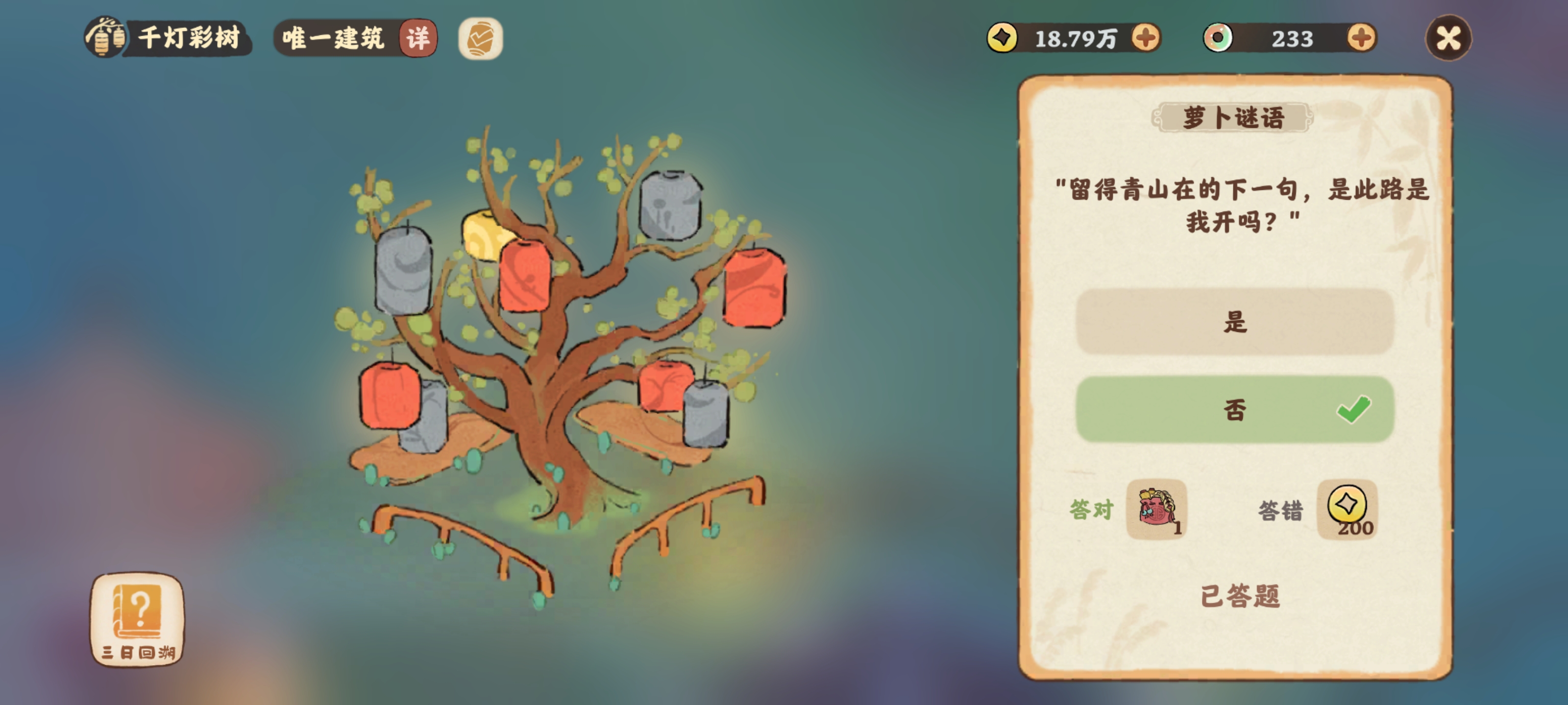 留得青山在的下一句是此路是我开吗?桃源深处有人家的新建筑千灯彩树可以进行谜题答题,大家知道留得青山在的下一句是此路是我开吗?下面为大家带来的具体内容,感兴趣的玩家们千万不要错过哦!