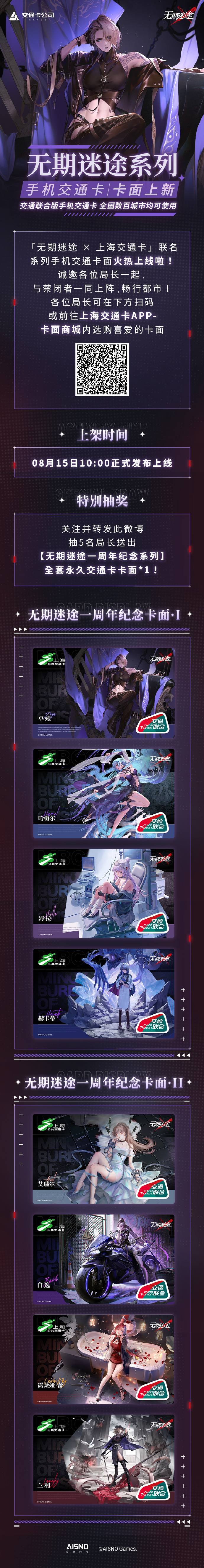 「无期迷途 × 上海交通卡」联名系列手机交通卡面08月15日10:00上线!