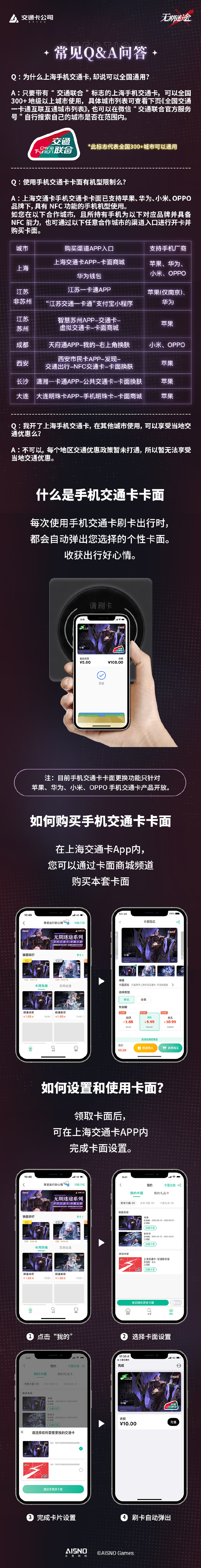 本次共有八款角色升阶装束卡面上线,卡面可用于上海|长沙|大连|西安|江苏发行的「全国交联版手机交通卡」,支持在全国数百城市使用,让局长出行更加便捷!