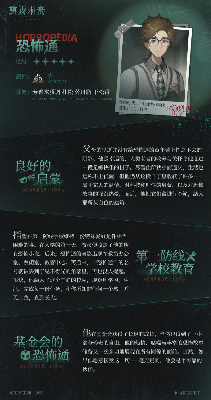 父母的早逝并没有给恐怖通的童年蒙上挥之不去的阴影。他是幸运的,人类老者的收养与关怀令他度过一段足够快乐的日子。尽管住所狭小而逼仄,生活也远称不上优渥,但他仍从这段日子里收获了许多——属于家人的温情,对科技和理性的启蒙,以及对恐怖故事的深沉热爱。而后,他把它们藏进行李箱,踏入那所灰白色的建筑。