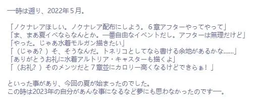 刚好今年日服泳装八期的主题算是2.6章为基础创作的,这里也顺便引用一下蘑菇近期的日记,回溯去年5月。