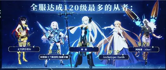 回到FES这边,官方也公布了国服最多120级的从者,第一名是摩根,第二名是妖兰,第三名是地球姬,第四名是仇凛,第五名是狂娜。