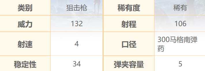 3级护甲:2枪致死优点伤害非常高,可无视3级头盔,射程高,子弹下坠小。缺点仅适合远距离使用,十分依赖高倍镜,对枪法依赖高。刷新率低,较难遇见。