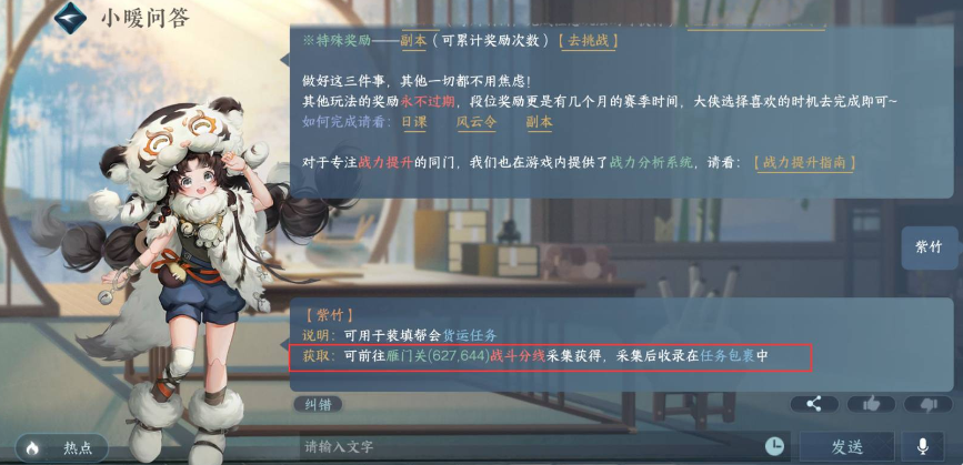 在逆水寒手游中,紫竹可以在雁门关坐标点627,644战斗分线处采集获得,采集后收录在任务包裹中,紫竹可用于装填帮会货运任务,如下图所示。