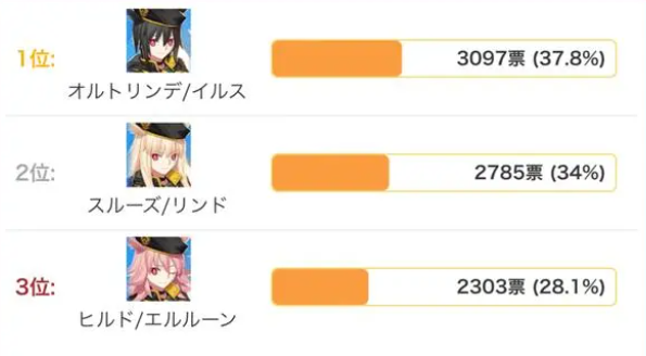 先简单的科普一下,斯露德=黄毛(cv:雨宫天)、希露德=粉毛(cv:小松未可子)、奥特琳德=黑毛(cv:田中美海),纯人气也就是选得最多的排名,应该是我记得去年日服是黑毛>黄毛>粉毛,当然这是日服那边的结果,国服这边横向来看也差不多是这个结果,主要是黑毛确实是人气方面更高一些,形象设计上也相对更吸引路人眼缘。
