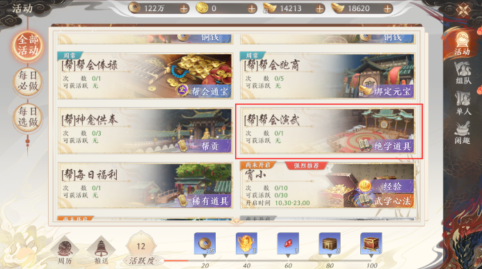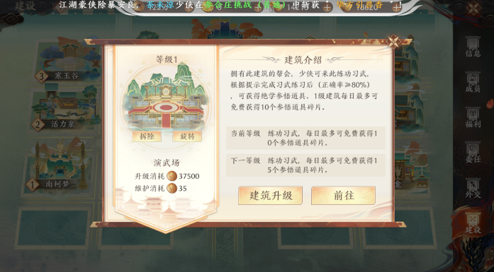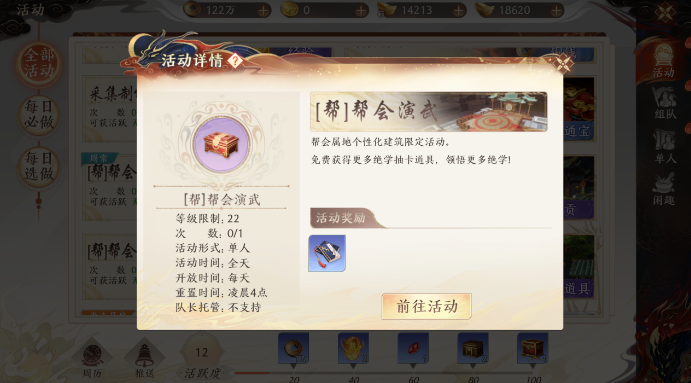 参与条件:加入帮会,并且拥有【演武场】建筑。