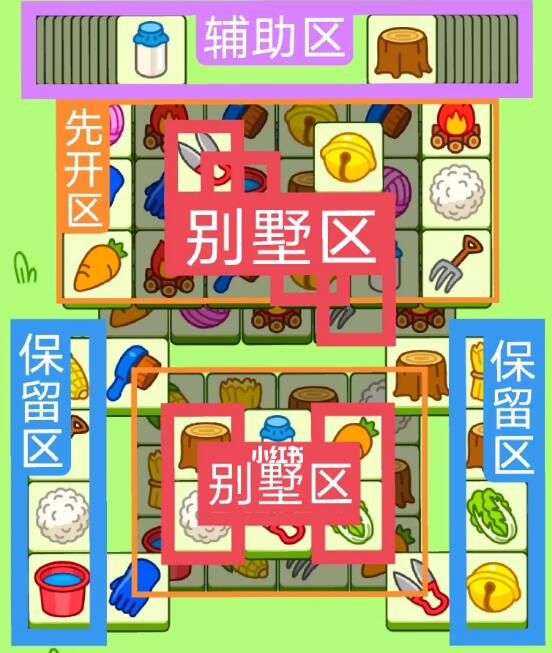 一个三角形大别墅,一个方形大别墅,开局先消除橙色区。橙色这里压牌此较多,然后按照一层层均匀消除表面牌。不要跨层太多拿牌,必要时可以用盲盒区辅助消除表面牌,尽量还是以别墅区内互相消除为主,蓝色区基本都是明牌,全部保留到后期使用。