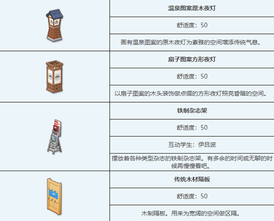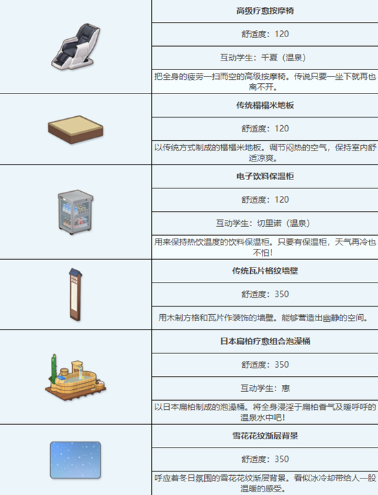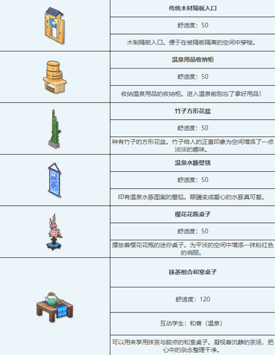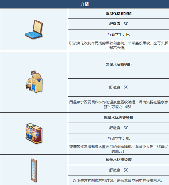 2、中等家具互动的角色都是温泉系列的,高级家具日本扁柏疗愈组合泡澡桶互动角色是惠。