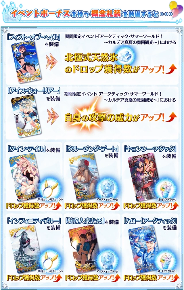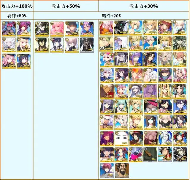 以上是本次活动的加成从者,依然是本期实装的泳装从者和泳装灵衣从者加上周年从者为主要加成,往期的泳装从者和灵衣从者为次要加成。
