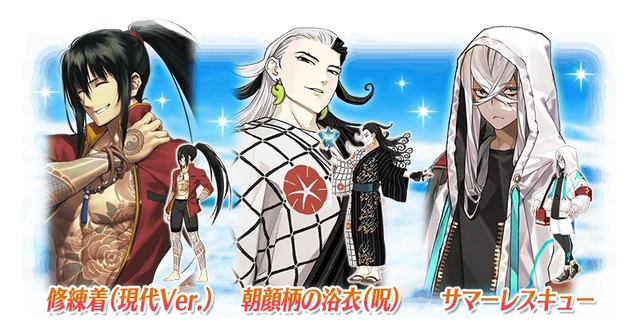 今年实装的泳装灵衣对象为五星的芦屋道满,四星的燕青和三星的阿斯克勒庇俄斯。