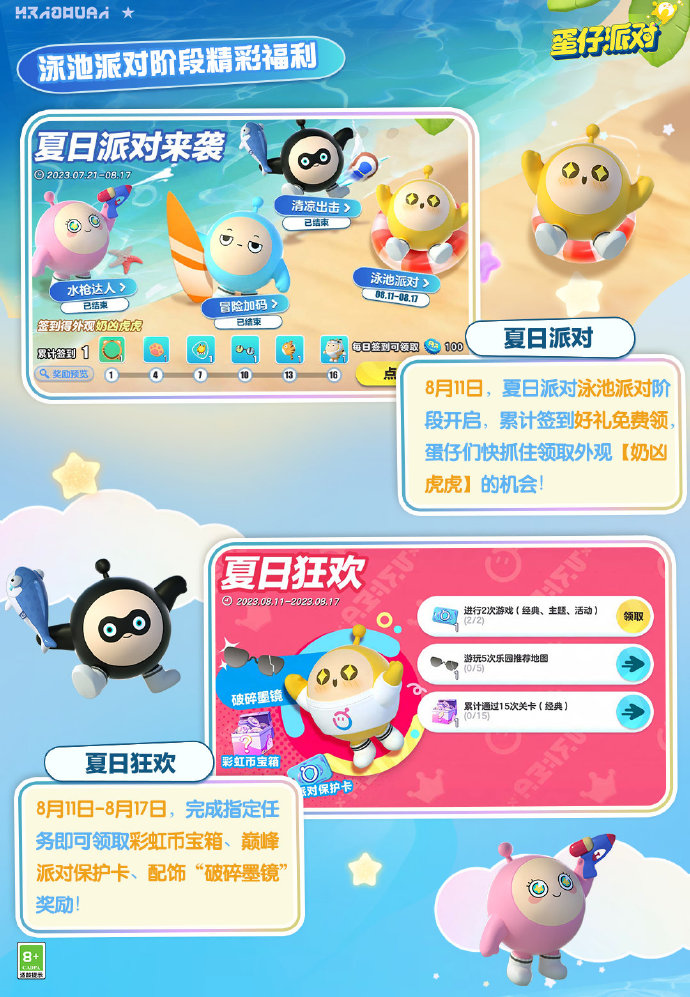 8月11日-8月17日,夏日派对【泳池派对】阶段携好礼叩响蛋仔岛的大门,蛋仔们速来跟随皮蛋一探福利详情!