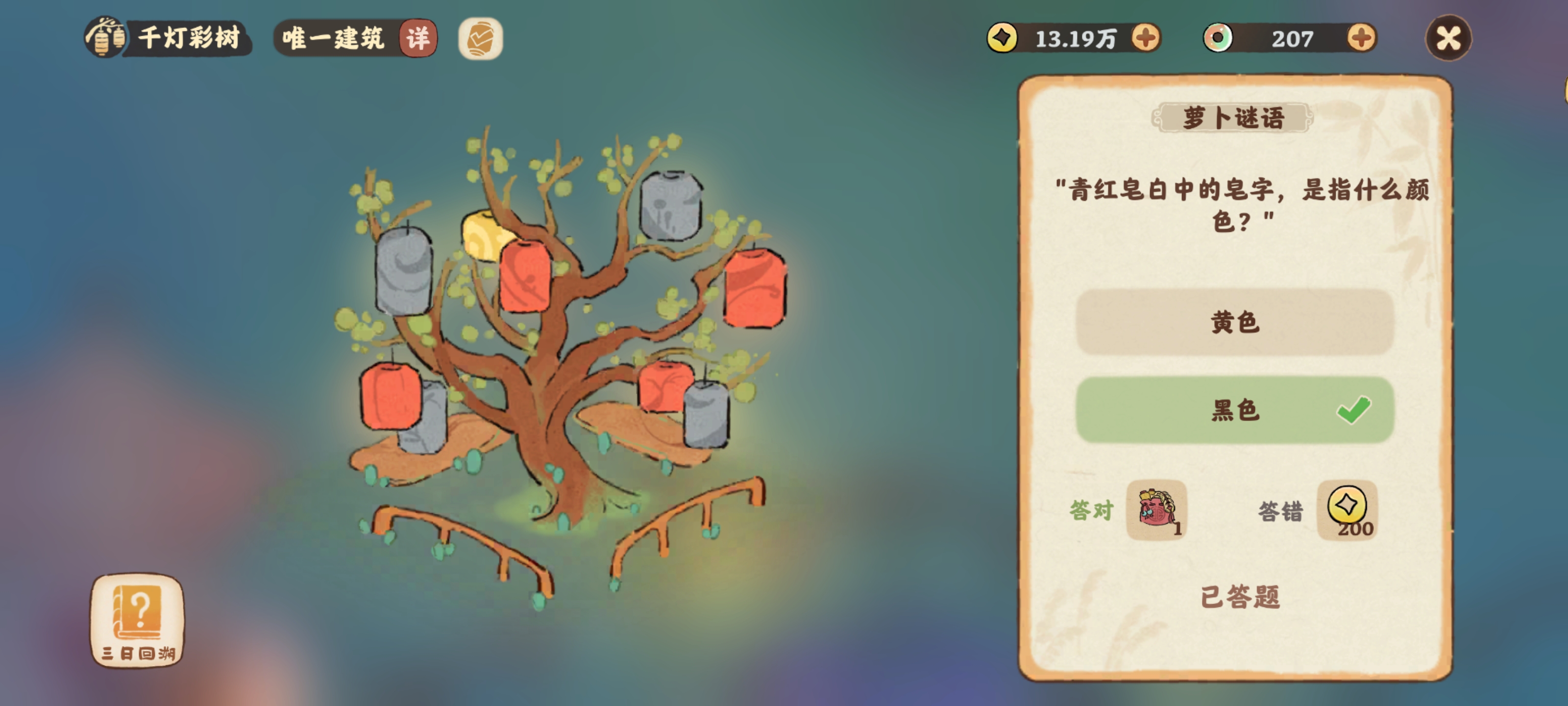 青红皂白中的皂字是指什么颜色?桃源深处有人家的新建筑千灯彩树可以进行谜题答题,大家知道青红皂白中的皂字是指什么颜色?下面为大家带来的具体内容,感兴趣的玩家们千万不要错过哦!