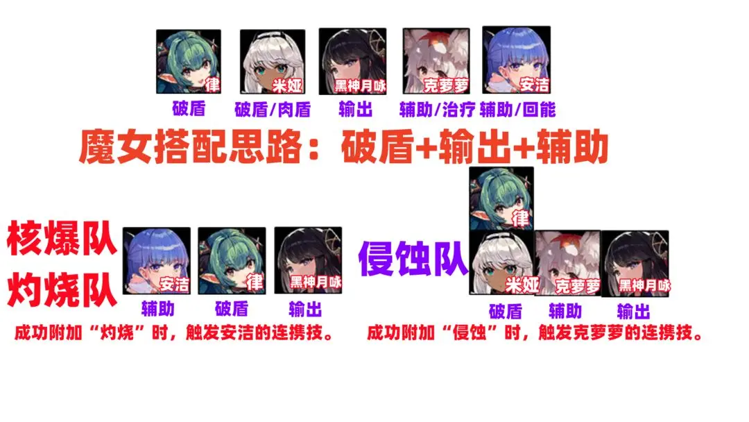 根据体系队特性或魔女的连携技效果进行搭配,详情参考下图: