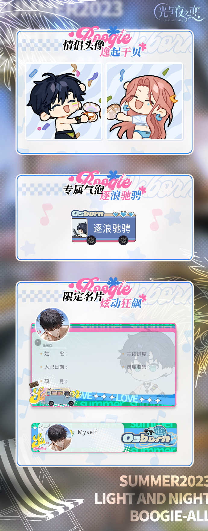 活动期间,将[绚日烈潮]系列限定灵犀培养至二花,可在限时计划处领取对应专属聊天气泡:[逐浪驰骋] [绯阳驰骋] [翠林驰骋] [暮影驰骋] [夕晖驰骋]。