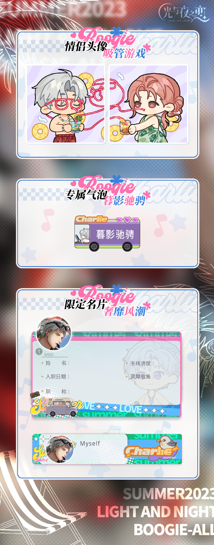 活动期间累计收信80次/120次/140次/160次/180次时,各可在限时计划处领取[情侣头像礼盒],打开后可随机获得以下任意一组情侣头像:[逸起干贝] [特甜草莓] [全面防晒] [吸管游戏] [流星舞者](不会重复获得)。