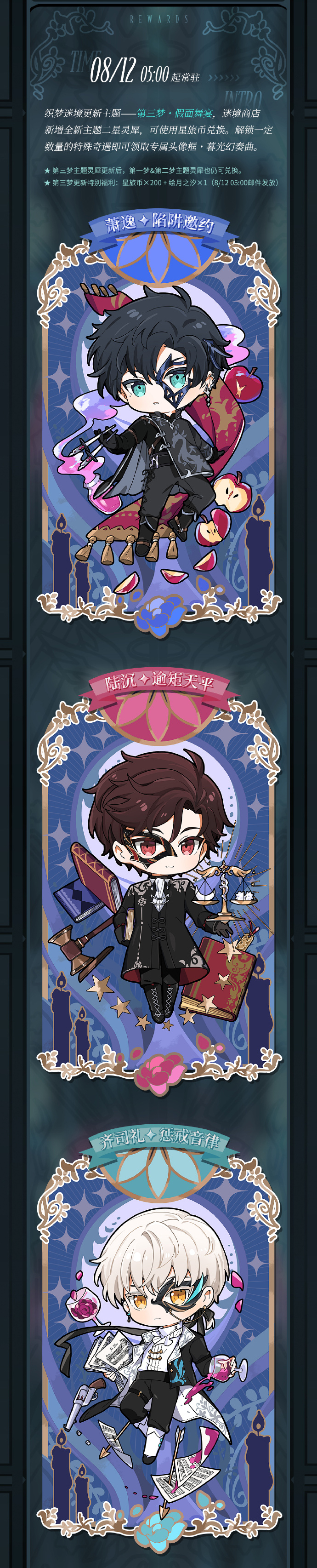 织梦迷境更新全新主题——第三梦・假面舞宴,迷境商店新增【全新主题二星灵犀】——萧逸・陷阱邀约、陆沉・逾矩天平、齐司礼・惩戒音律、查理苏・隐秘筹码、夏鸣星・终末仪式,可使用星旅币兑换。解锁一定数量的特殊奇遇即可领取【专属头像框・暮光幻奏曲】。