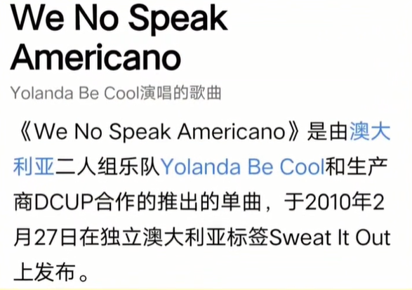 该梗源于曲目《we no speak Americano》,翻译过来是我们不说美国话的意思
