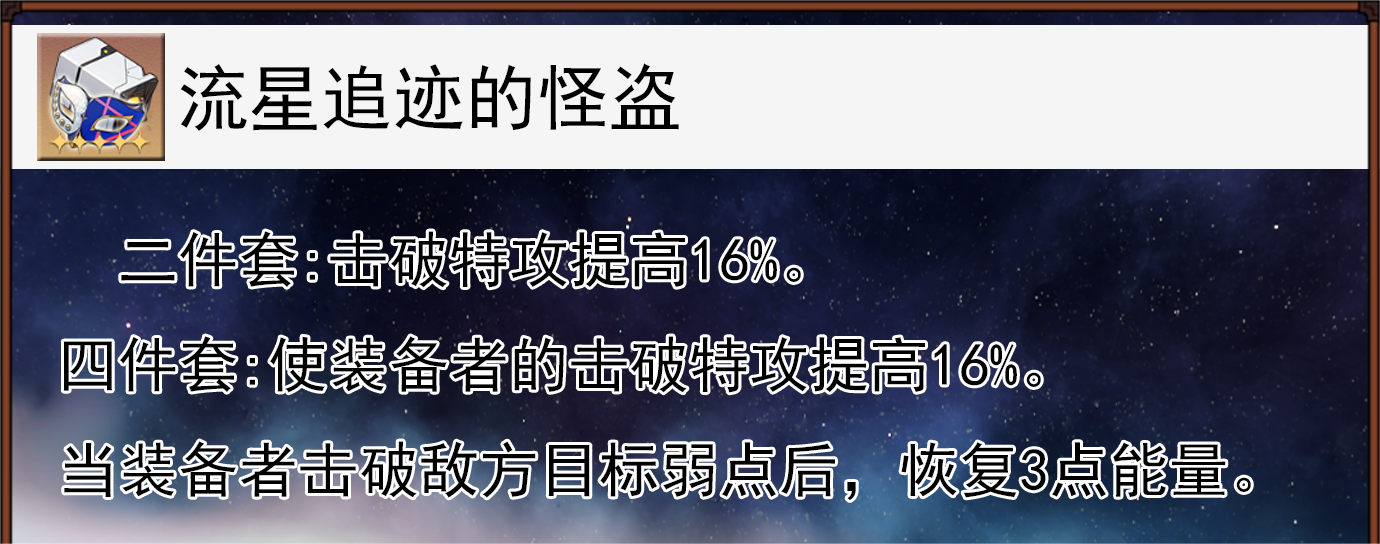 当装备者击破敌方冒标弱点后,恢复3点能量。
