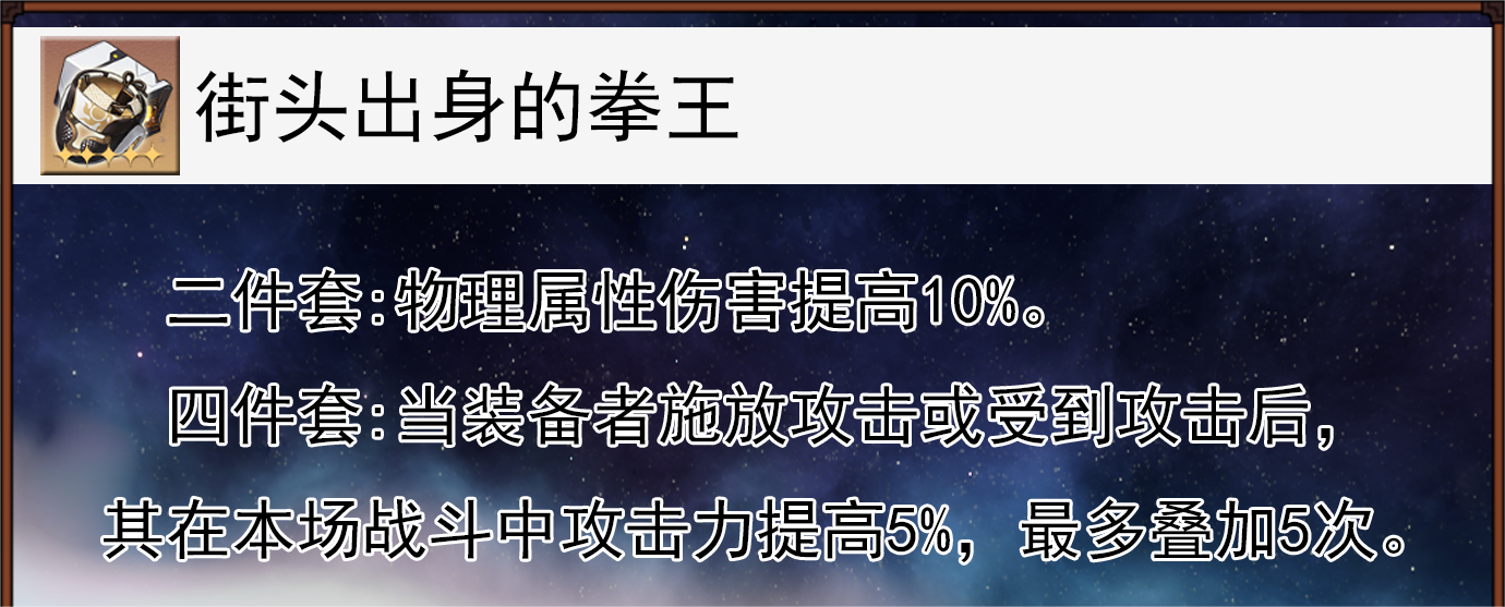 四件套:当装备者施放攻击或受到攻击后,其在本场战斗中攻击力提高5%,最多叠加5次。