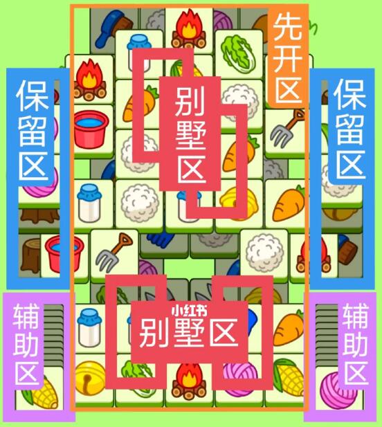 一个2+2+2叠牌大别墅,一个工字型大别墅,开局先消除橙色区,然后按照一层层均匀消除表面牌,哪里压牌比较多就先消除哪里,必要时可以用盲盒区辅助消除表面牌,尽量还是以别墅区内互相消除为主,蓝色区有叠牌,但是不多,全部保留到后期使用,下边两个是明牌