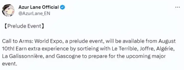 先说具体的公告,一场拉开序幕的大型展会活动,将于8月10日抢先开启开始!与可怖,霞飞,阿尔及利亚,拉.加利索尼埃,加斯科涅一起共行,为即将到来的重大活动做准备,从而获得额外的经验吧。敬请关注!