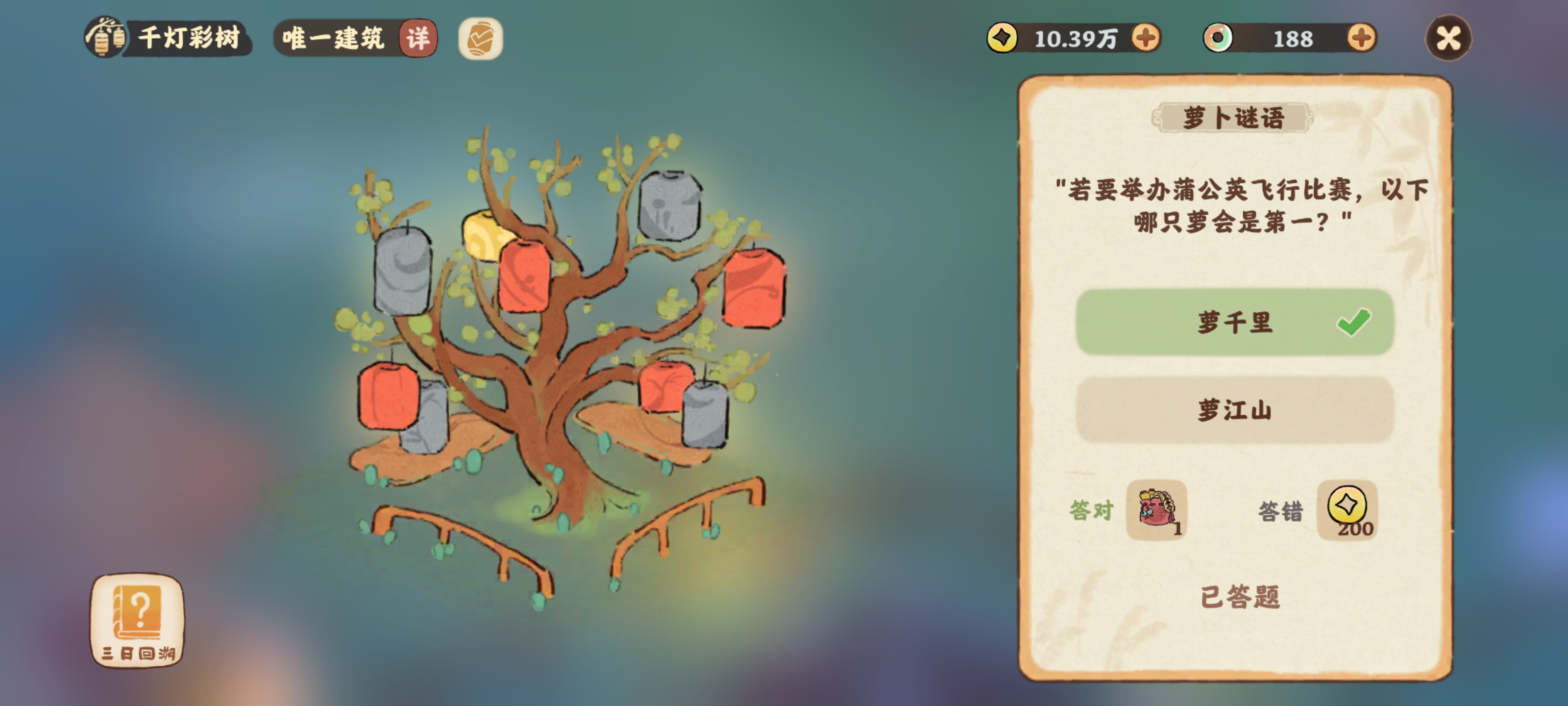 若要举办蒲公英飞行比赛以下哪只萝会是第一?桃源深处有人家的新建筑千灯彩树可以进行谜题答题,大家知道若要举办蒲公英飞行比赛以下哪只萝会是第一?下面为大家带来的具体内容,感兴趣的玩家们千万不要错过哦!