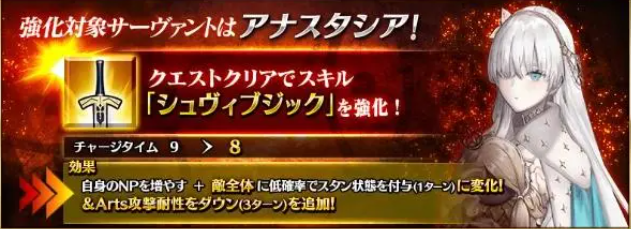 本次皇女强化的是三技能的自充,原本的技能系效果是50NP的自充+1回合60%概率的单体晕眩的效果,强化后将晕眩的效果直接强化到了对敌人全体施加这种效果,但是概率还是60%不变,另外就是敌方全体蓝卡耐性降低30%3t,不过有个好消息,就是这技能的CD减少了1回合。