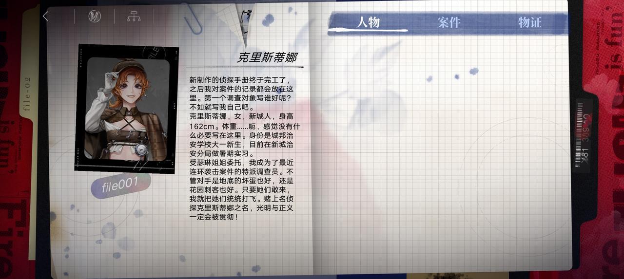 1.在探案过程中,克里斯蒂娜会将遭遇的所有状况都记录在探案簿中,包括她所遭遇的人,案件以及在现场调查中发现的证物。