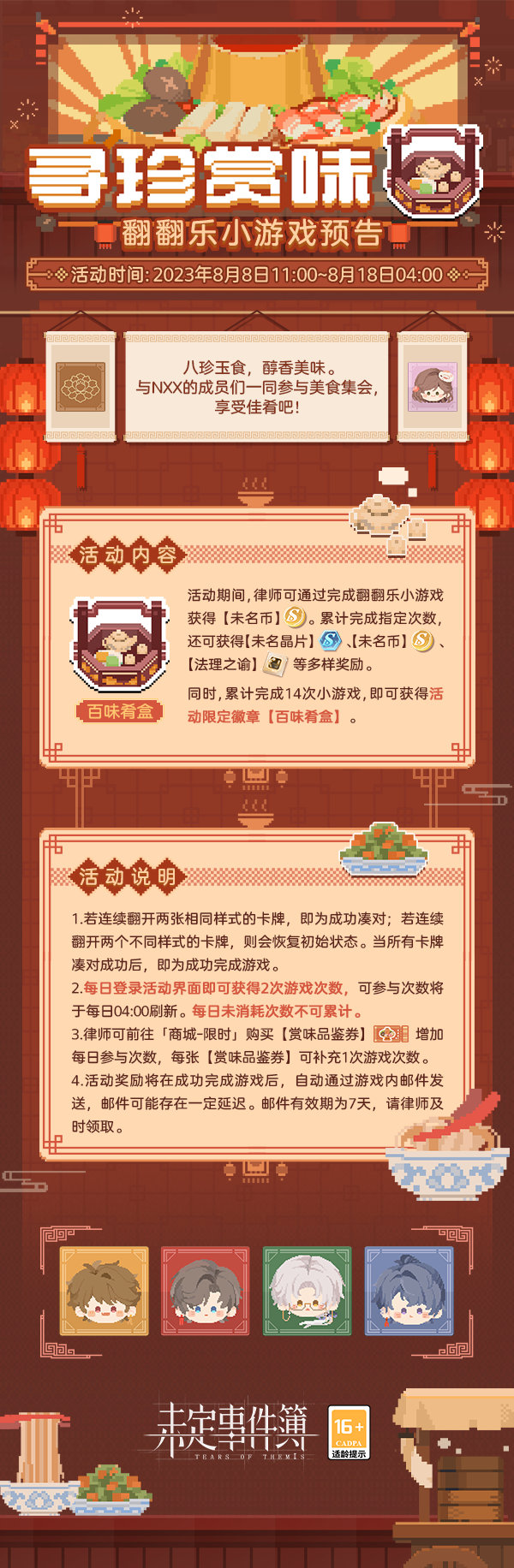 未定事件簿寻珍赏味翻翻乐小游戏将在8.8日更新后上线,大家知道活动的具体信息吗?下面为大家带来活动的具体内容,感兴趣的玩家们千万不要错过哦!